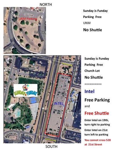 Parking is available at UNM and the First Baptist Church near Grande and 19th Ave and at Intel. Free shuttles will be available from Intel to Haynes park. Boys and Girls Club buses will take you to the park entrance and back. Enter the Intel property from 19th Ave and turn right to parking or from 21st Ave turn left to parking.